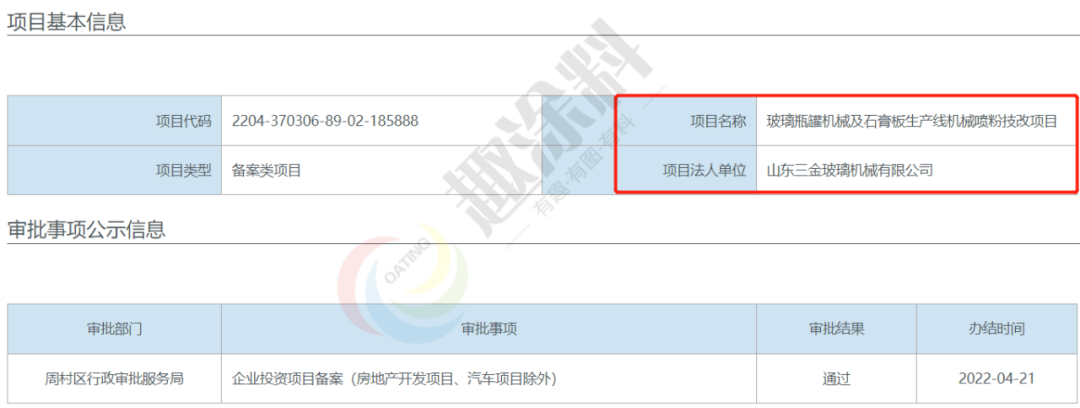 2022年4月21日,山東三金玻璃機(jī)械有限公司,玻璃瓶罐機(jī)械及石膏板生產(chǎn)線機(jī)械噴粉技改項(xiàng)目,在周村區(qū)行政審批服務(wù)局,進(jìn)行企業(yè)投資項(xiàng)目備案。