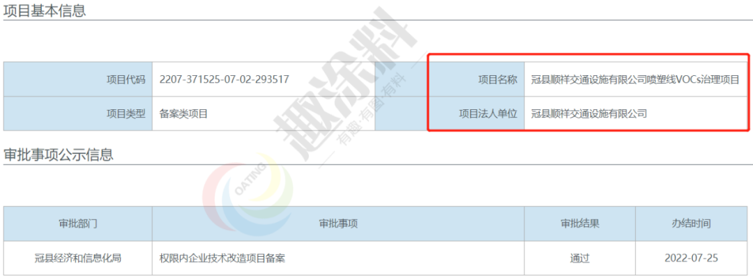2022年6月2日,山東冠縣四通交通設施有限公司,噴塑線VOCs治理項目,在冠縣經濟和信息化局,進行權限內企業(yè)技術改造項目備案。