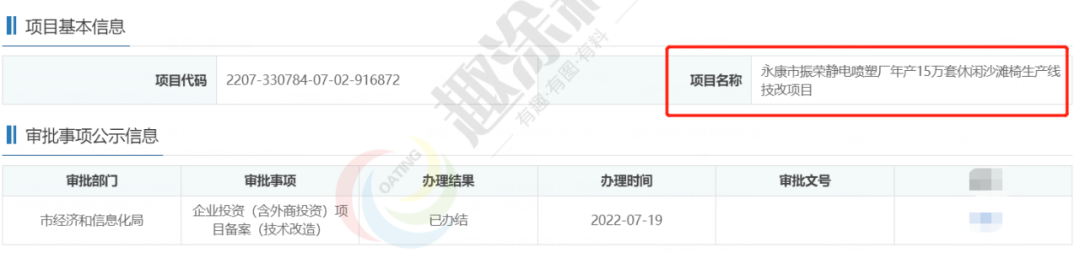 2022年7月19日,永康市振榮靜電噴塑廠,年產15萬套休閑沙灘椅生產線技改項目,在市經濟和信息化局,進行企業(yè)投資(含外商投資)項目備案(技術改造)。