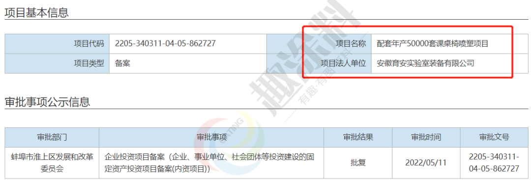 2022年5月11日,安徽育安實驗室裝備有限公司,配套年產50000套課桌椅噴塑項目,在蚌埠市淮上區(qū)發(fā)展和改革委員會,進行企業(yè)投資項目備案。