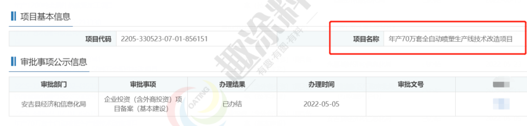 2022年6月20日,江蘇無錫歐派集成家居有限公司,柔性化智能噴粉自動線項目,在無錫市惠山區(qū)行政審批局,進行企業(yè)項目備案。