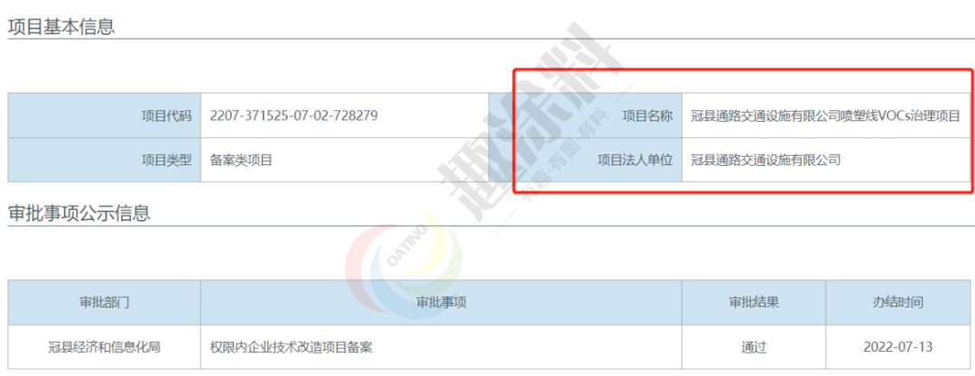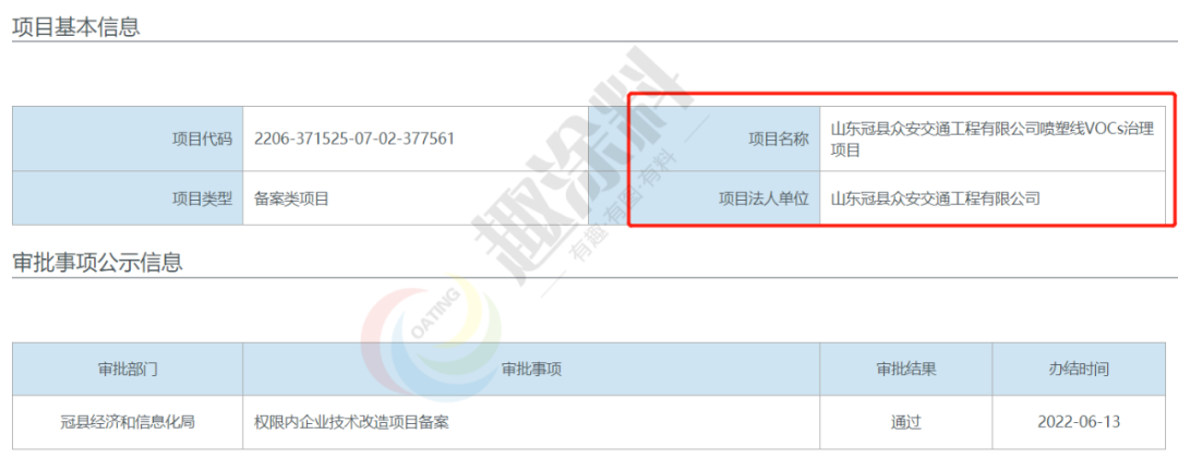 2022年6月13日,山東冠縣眾安交通工程有限公司,噴塑線VOCs治理項目,在冠縣經濟和信息化局,進行權限內企業(yè)技術改造項目備案。