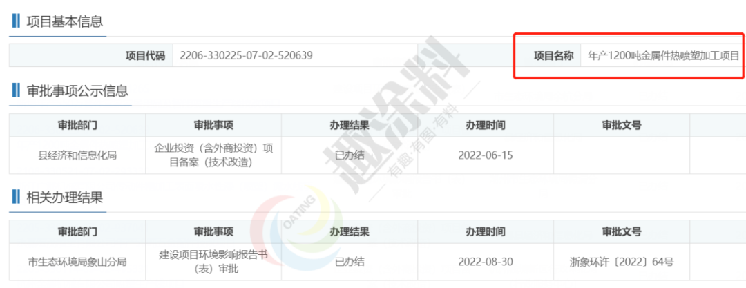 2022年6月15日,寧波亞大金屬表面處理有限公司,年產1200噸金屬件熱噴塑加工項目,在縣經濟和信息化局,進行企業(yè)投資(含外商投資)項目備案(技術改造)。