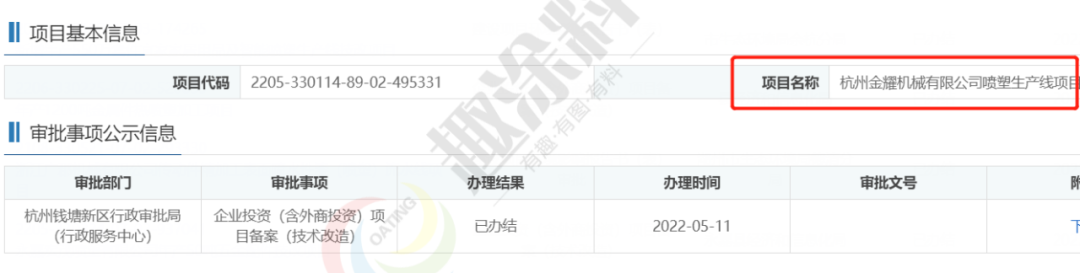 2022年5月11日,杭州金耀機械有限公司,噴塑生產線項目,在杭州錢塘新區(qū)行政審批局,進行企業(yè)投資(含外商投資)項目備案(技術改造)。