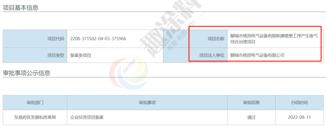 2022年8月11日,聊城市格邦電氣設備有限公司,新建噴塑工序產生廢氣綜合治理項目,在東昌府區(qū)發(fā)展和改革局,進行企業(yè)投資項目備案。