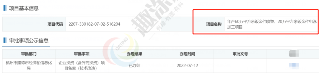 2022年7月12日,建德市旭豐金屬表面處理廠,年產60萬平方米鈑金件噴塑、20萬平方米鈑金件電泳加工項目,在杭州市建德市經濟和信息化局,進行企業(yè)投資(含外商投資)項目備案(技術改造)。