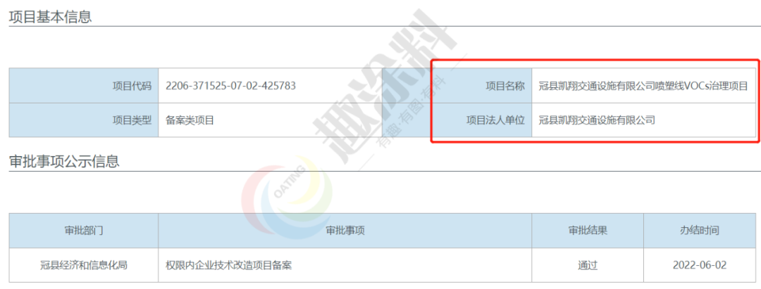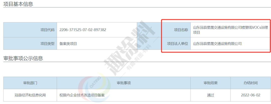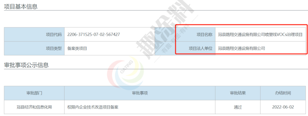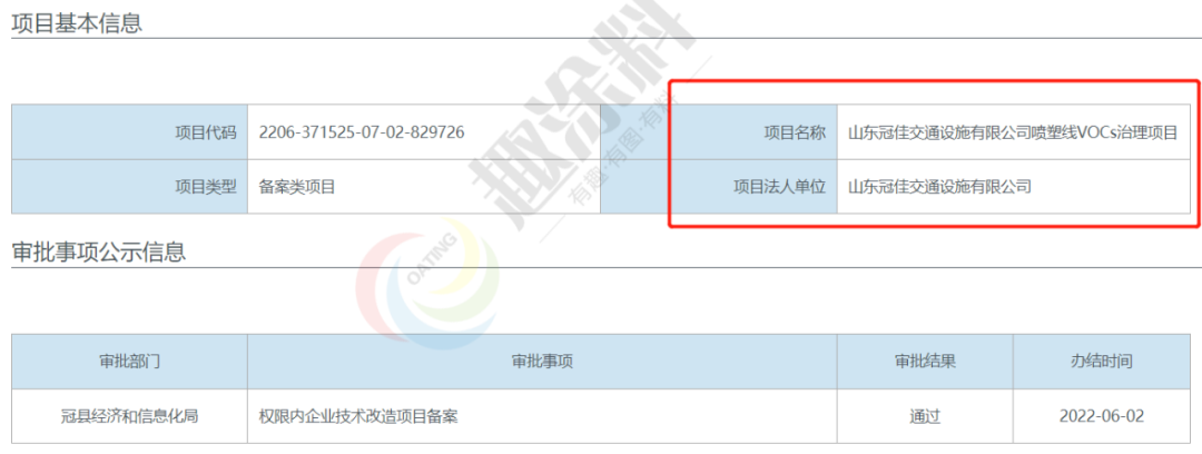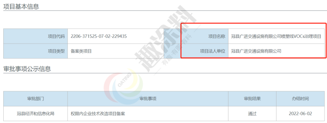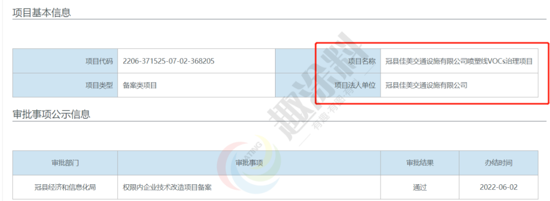 2022年6月2日,山東冠佳交通設施有限公司,噴塑線VOCs治理項目,在冠縣經濟和信息化局,進行權限內企業(yè)技術改造項目備案。