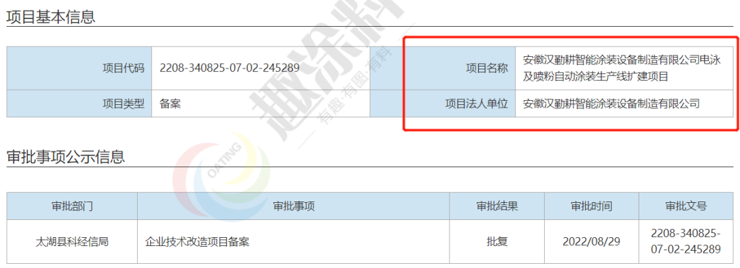 2022年8月29日,安徽漢勤耕智能涂裝設備制造有限公司,電泳及噴粉自動涂裝生產線擴建項目,在太湖縣科經信局,進行企業(yè)技術改造項目備案。