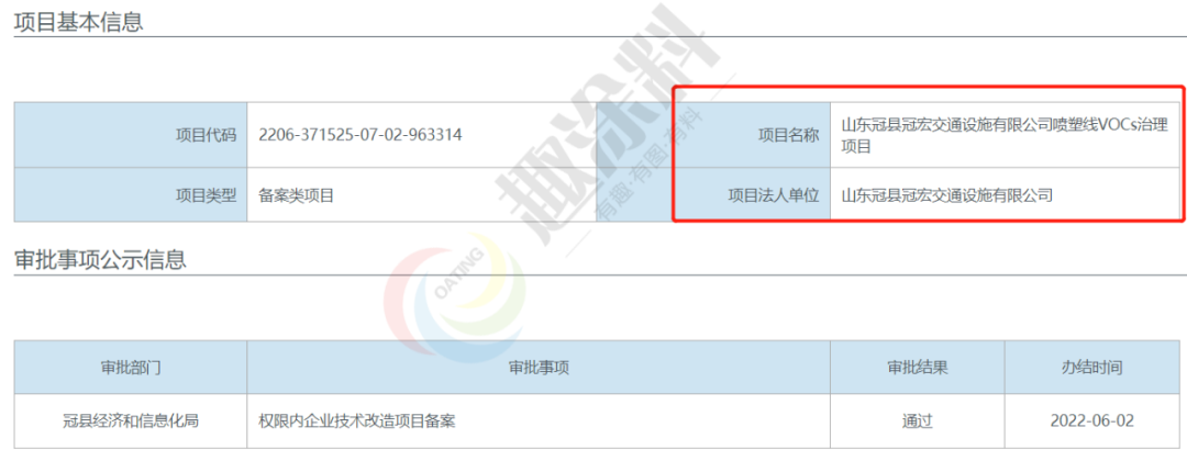 2022年6月2日,山東冠縣冠宏交通設施有限公司,噴塑線VOCs治理項目,在冠縣經濟和信息化局,進行權限內企業(yè)技術改造項目備案。