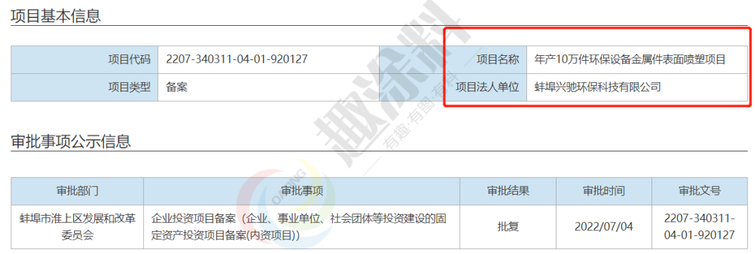2022年7月4日,蚌埠興馳環(huán)??萍加邢薰?,年產10萬件環(huán)保設備金屬件表面噴塑項目,在蚌埠市淮上區(qū)發(fā)展和改革委員會,進行企業(yè)投資項目備案。