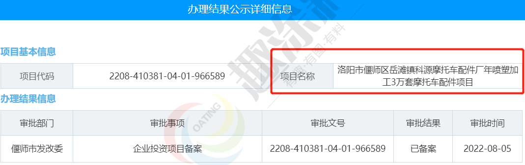 2022年8月5日,洛陽市偃師區(qū)岳灘鎮(zhèn)科源摩托車配件廠,年噴塑加工3萬套摩托車配件項目,在偃師市發(fā)改委,進行企業(yè)投資項目備案。