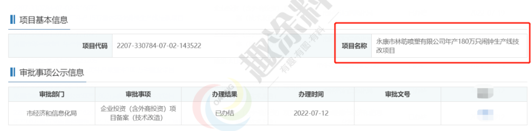 2022年7月12日,永康市林昉噴塑有限公司,年產180萬只鬧鐘生產線技改項目,在市經濟和信息化局,進行企業(yè)投資(含外商投資)項目備案(技術改造)。