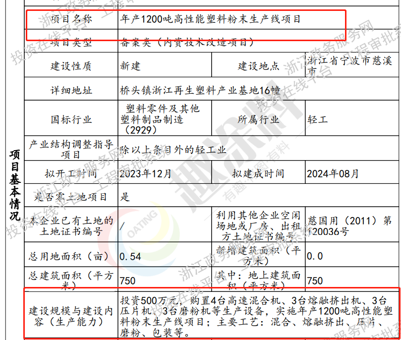 2023年7月3日,慈溪市恒環(huán)新材料有限公司,年產(chǎn)1200噸高性能塑料粉末生產(chǎn)線項目,在市經(jīng)濟和信息化局,進行企業(yè)投資(含外商投資)項目備案(技術(shù)改造)。