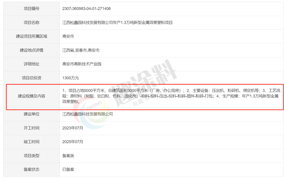 2023年7月12日,江西松鑫園科技發(fā)展有限公司,年產(chǎn)1.3萬噸新型金屬效果塑粉項目,進行企業(yè)項目備案。