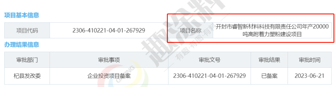 2023年6月21日,開封市睿智新材料科技有限責任公司,年產(chǎn)20000噸高附著力塑粉建設(shè)項目,在杞縣發(fā)改委,進行企業(yè)投資項目備案。