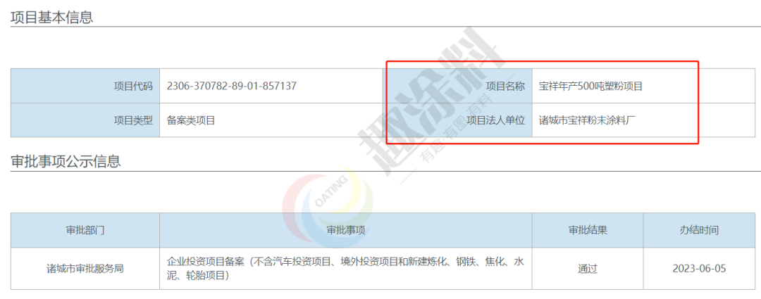 2023年6月5日,諸城市寶祥粉末涂料廠,寶祥年產(chǎn)500噸塑粉項目,在諸城市審批服務(wù)局,進行企業(yè)投資項目備案(不含汽車投資項目、境外投資項目和新建煉化、鋼鐵、焦化、水泥、輪胎項目)。