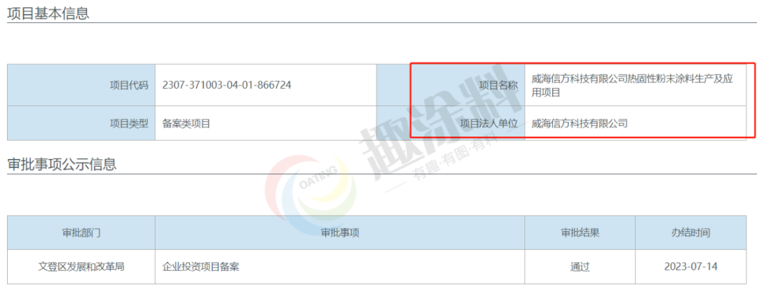 2023年7月14日,威海信方科技有限公司,熱固性粉末涂料生產(chǎn)及應(yīng)用項目,在文登區(qū)發(fā)展和改革局,進行企業(yè)投資項目備案。