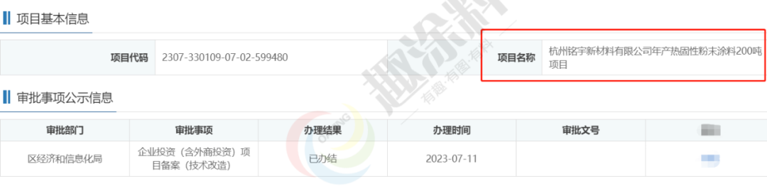 2023年7月11日,杭州銘宇新材料有限公司,年產(chǎn)熱固性粉末涂料200噸項目,在區(qū)經(jīng)濟和信息化局,進行企業(yè)投資(含外商投資)項目備案(技術(shù)改造)。