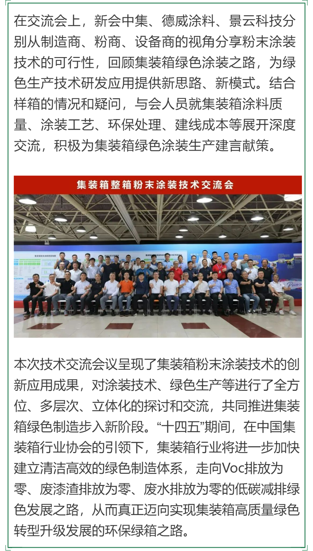 8月25日,來(lái)自全國(guó)各地集裝箱生產(chǎn)制造相關(guān)領(lǐng)域的企業(yè)匯聚廣東省江門(mén)市,共同參加了2023年集裝箱整箱粉末涂裝技術(shù)交流會(huì)。本次交流由中集集裝箱(集團(tuán))主辦,新會(huì)中集承辦,向行業(yè)展示集裝箱整箱粉末涂裝技術(shù)最新發(fā)展成果。