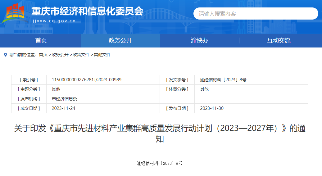 近日,重慶經(jīng)濟(jì)和信息化委員會(huì)印發(fā)《重慶市先進(jìn)材料產(chǎn)業(yè)集群高質(zhì)量發(fā)展行動(dòng)計(jì)劃(2023—2027年)》的通知(以下簡(jiǎn)稱"通知")。
