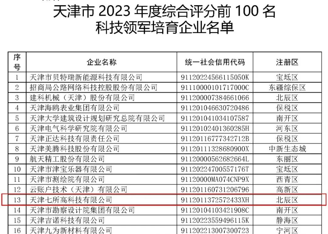 近日,天津市科技局網(wǎng)站發(fā)布《天津市2023年度綜合評(píng)分前100名雛鷹企業(yè)、瞪羚企業(yè)、科技領(lǐng)軍培育企業(yè)和科技領(lǐng)軍企業(yè)名單的公告》,七所高科位列科技領(lǐng)軍培育企業(yè)第13名。此次公告的各類企業(yè)前100名是根據(jù)企業(yè)2022年度營(yíng)業(yè)收入、利潤(rùn)、納稅、科技量化積分等指標(biāo),對(duì)2023年入庫(kù)的天津市雛鷹企業(yè)、瞪羚企業(yè)、科技領(lǐng)軍培育企業(yè)和科技領(lǐng)軍企業(yè)進(jìn)行了綜合評(píng)分。