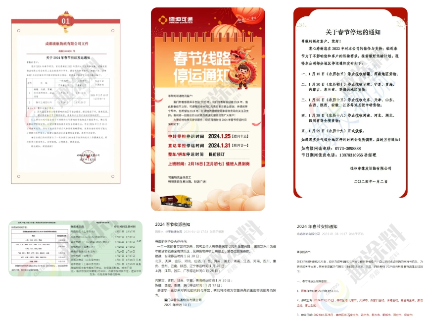 隨著春節(jié)的臨近,近日全國各地物流公司紛紛發(fā)布了春節(jié)放假通知。