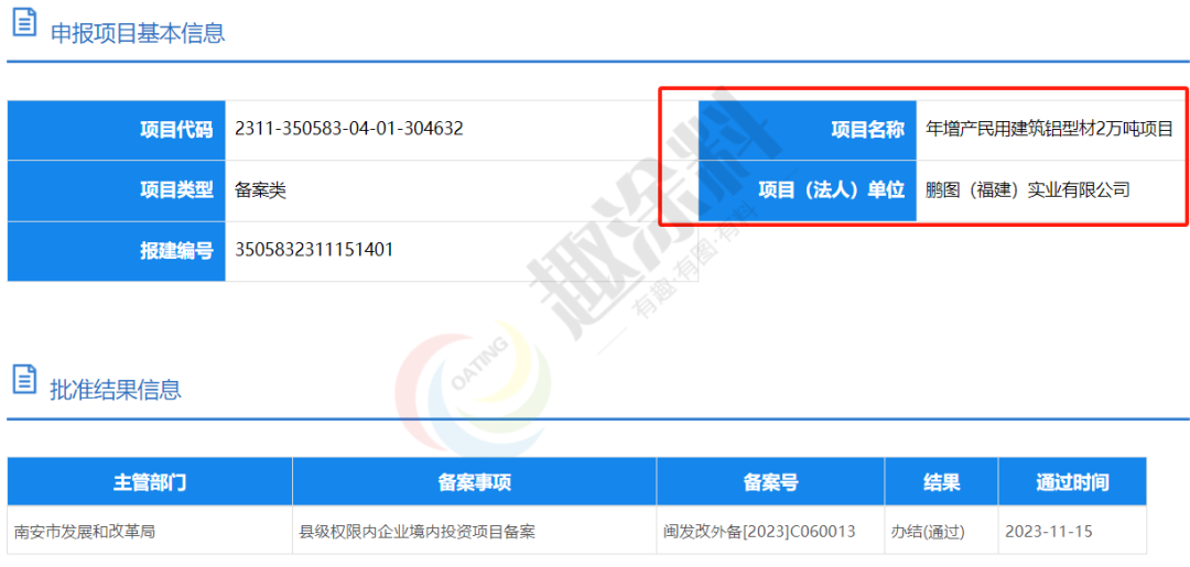 2023年11月15日,鵬圖(福建)實業(yè)有限公司,年增產(chǎn)民用建筑鋁型材2萬噸項目,在南安市發(fā)展和改革局,縣級權(quán)限內(nèi)企業(yè)境內(nèi)投資項目備案。