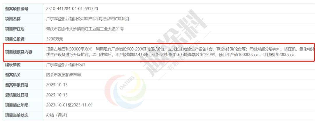 2023年10月13日,廣東高登鋁業(yè)有限公司,年產(chǎn)4萬噸鋁型材擴建項目,在四會市發(fā)展和改革局,進行企業(yè)投資項目備案。