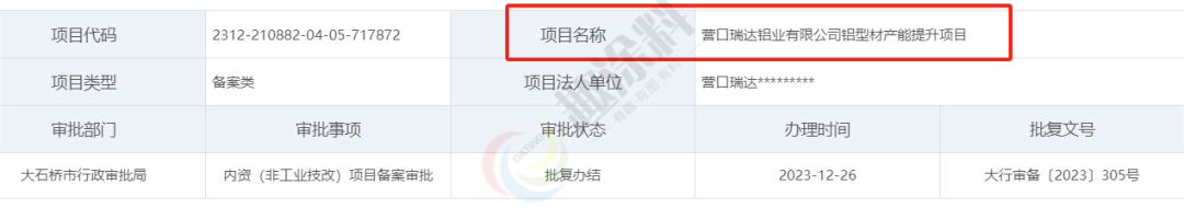 2023年12月26日,營口瑞達鋁業(yè)有限公司,鋁型材產(chǎn)能提升項目,在大石橋市行政審批局,進行內(nèi)資(非工業(yè)技改)項目備案審批。