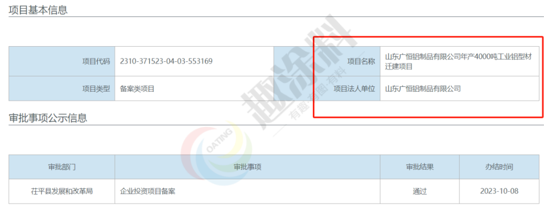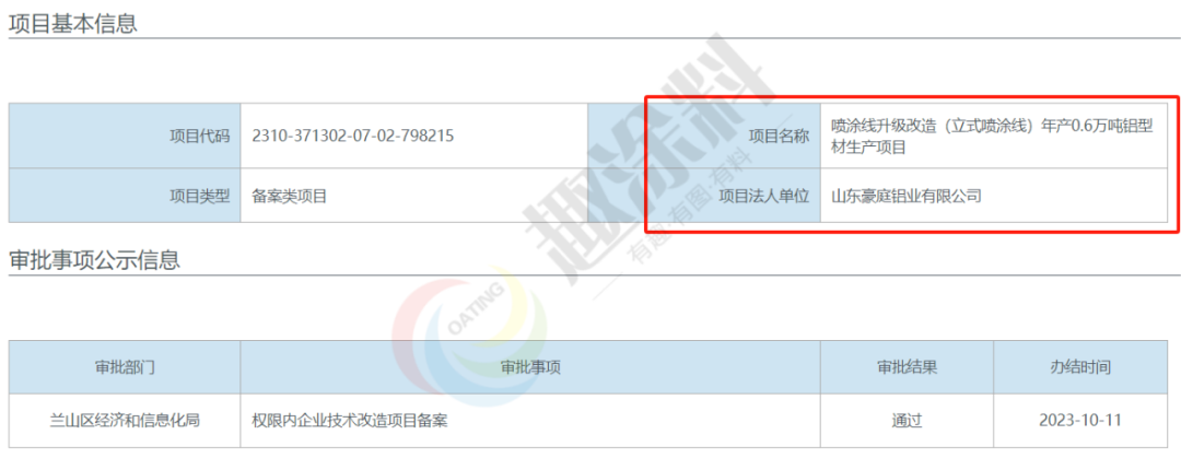 2023年10月11日,山東豪庭鋁業(yè)有限公司,噴涂線升級改造(立式噴涂線)年產(chǎn)0.6萬噸鋁型材生產(chǎn)項目,在蘭山區(qū)經(jīng)濟和信息化局,進行權(quán)限內(nèi)企業(yè)技術(shù)改造項目備案。
