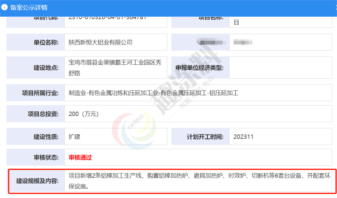 2023年10月18日,陜西新恒大鋁業(yè)有限公司,鋁型材加工生產(chǎn)線擴建項目,進行企業(yè)投資項目備案。