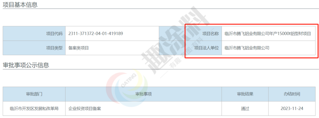 2023年11月24日,臨沂市騰飛鋁業(yè)有限公司,年產(chǎn)15000t鋁型材項目,在臨沂市開發(fā)區(qū)發(fā)展和改革局,進行企業(yè)投資項目備案。