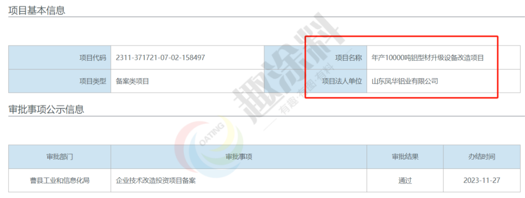 2023年12月26日,山東華明鋁材有限公司,噴涂鋁型材技術(shù)改造項目,進行企業(yè)投資項目備案。