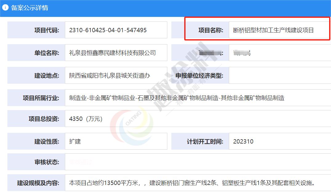 2023年10月12日,禮泉縣恒鑫惠民建材科技有限公司,斷橋鋁型材加工生產(chǎn)線建設(shè)項目,進行企業(yè)投資項目備案。