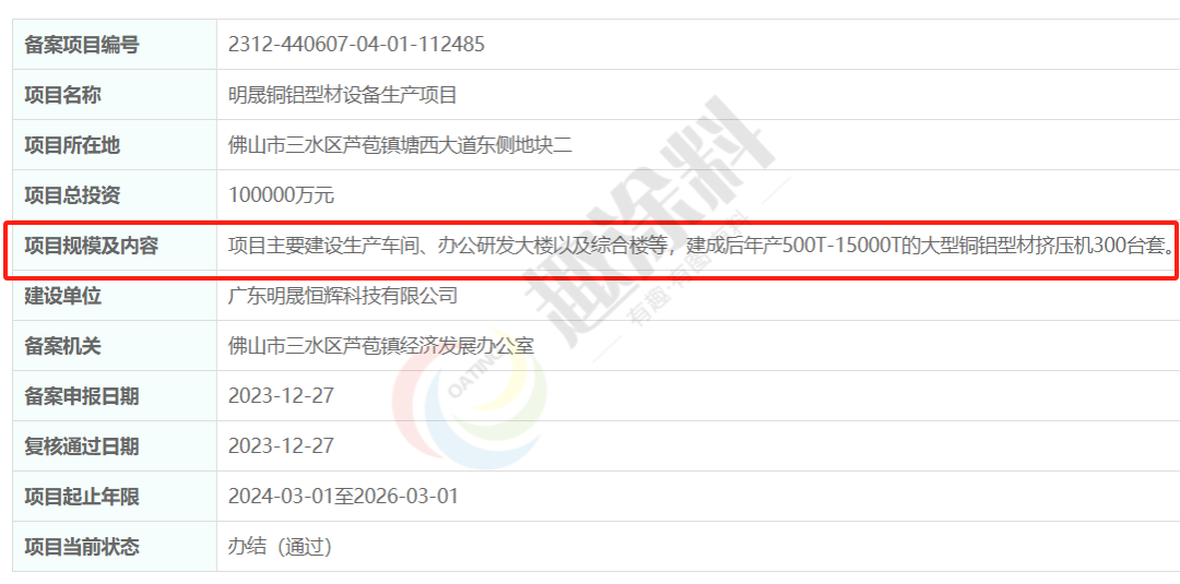 2023年12月27日,廣東明晟恒輝科技有限公司,銅鋁型材設(shè)備生產(chǎn)項目,在佛山市三水區(qū)蘆苞鎮(zhèn)經(jīng)濟發(fā)展辦公室,進行企業(yè)投資項目備案。