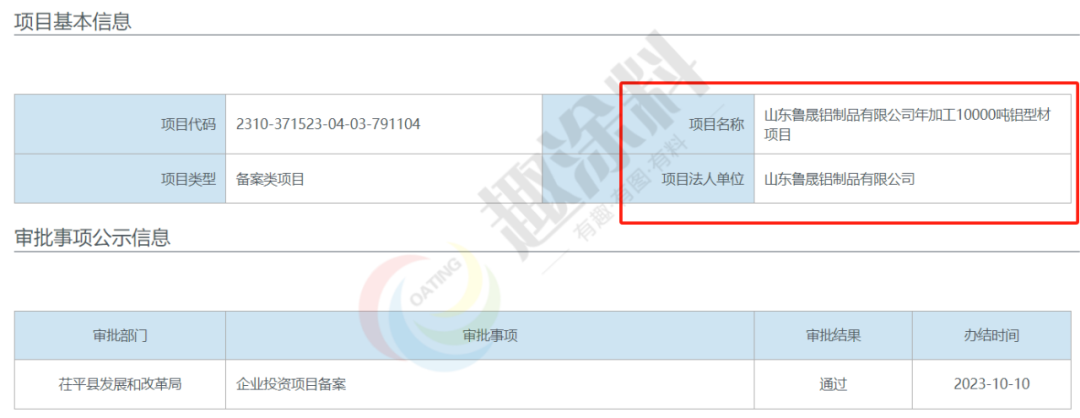 2023年10月10日,山東魯晟鋁制品有限公司,年加工10000噸鋁型材項目,在茌平縣發(fā)展和改革局,進行企業(yè)投資項目備案。