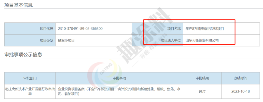 2023年10月13日,山東天衢鋁業(yè)有限公司,年產(chǎn)8萬噸高端鋁型材項目,在棗莊高新技術(shù)產(chǎn)業(yè)開發(fā)區(qū)行政審批局,進行企業(yè)投資項目備案。