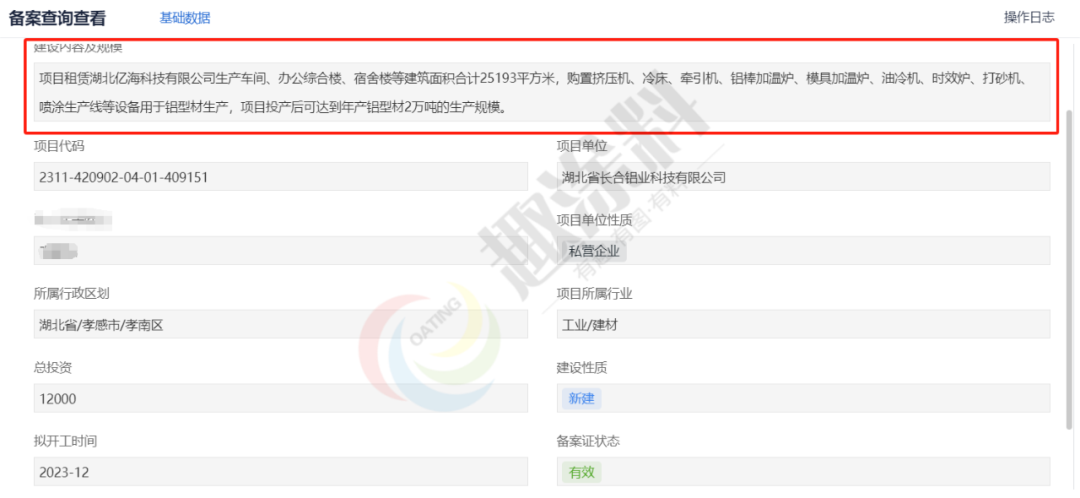 2023年10月19日,安徽柯美特鋁業(yè)有限公司,年產(chǎn)8萬噸鋁型材(一期)項目,在南陵縣發(fā)展改革委,進行企業(yè)投資項目備案(企業(yè)、事業(yè)單位、社會團體等投資建設(shè)的固定資產(chǎn)投資項目備案(內(nèi)資項目)。