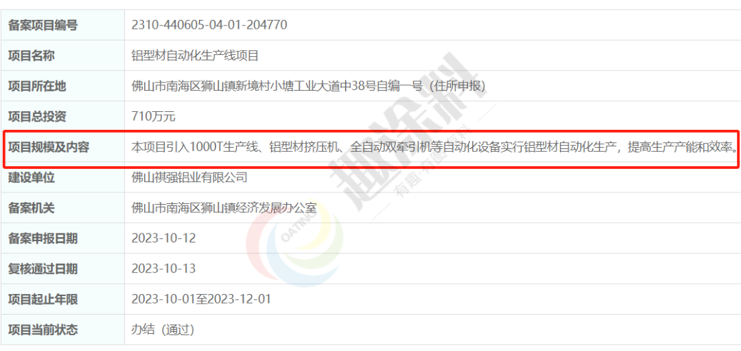 2023年10月13日,佛山祺強鋁業(yè)有限公司,鋁型材自動化生產(chǎn)線項目,進行企業(yè)投資項目備案。