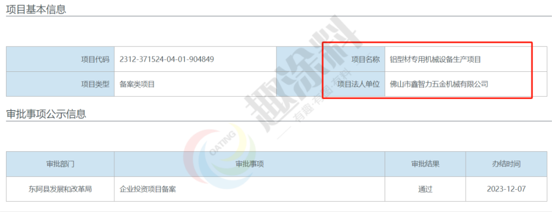 2023年12月7日,佛山市鑫智力五金機械有限公司,鋁型材專用機械設(shè)備生產(chǎn)項目,在東阿縣發(fā)展和改革局,進行企業(yè)投資項目備案。