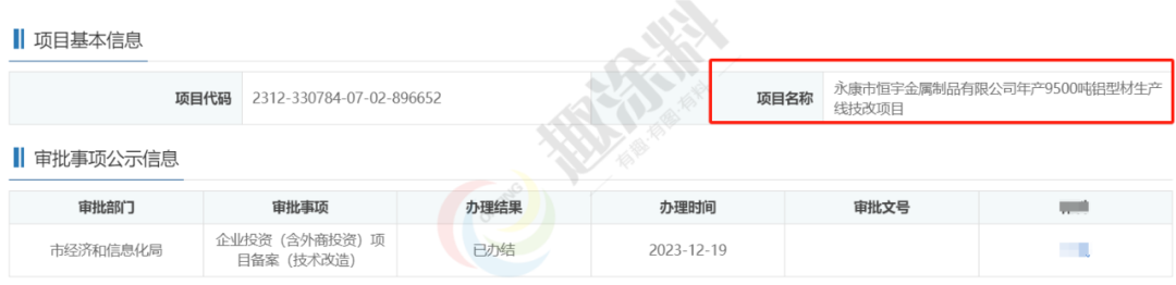 2023年12月19日,永康市恒宇金屬制品有限公司,年產(chǎn)9500噸鋁型材生產(chǎn)線技改項目,在市經(jīng)濟和信息化局,進行企業(yè)投資(含外商投資)項目備案(技術(shù)改造)。