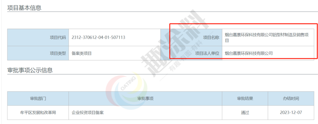 2023年12月7日,煙臺嘉景環(huán)保科技有限公司,鋁型材制造及銷售項目,在牟平區(qū)發(fā)展和改革局,進行企業(yè)投資項目備案。