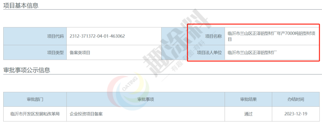 2023年12月18日,臨沂市蘭山區(qū)正澤鋁型材廠,年產(chǎn)7000噸鋁型材項目,在臨沂市開發(fā)區(qū)發(fā)展和改革局,進行企業(yè)投資項目備案。