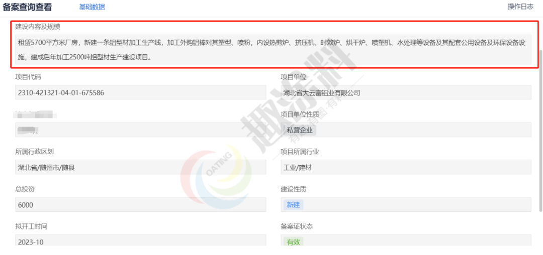 2023年10月30日,湖北省大云富鋁業(yè)有限公司,年加工2500噸鋁型材生產(chǎn)建設(shè)項目,進行企業(yè)投資項目備案。