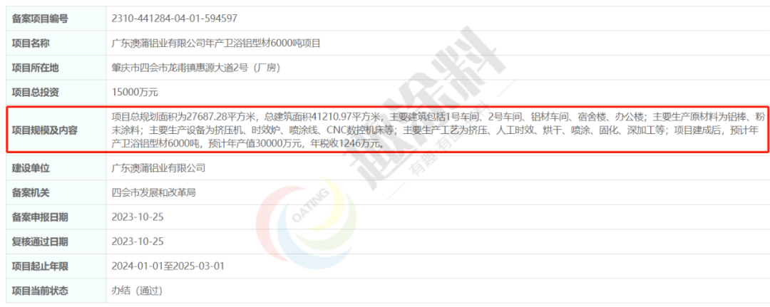 2023年10月25日,廣東澳蒲鋁業(yè)有限公司,年產(chǎn)衛(wèi)浴鋁型材6000噸項目,在四會市發(fā)展和改革局,進行企業(yè)投資項目備案。