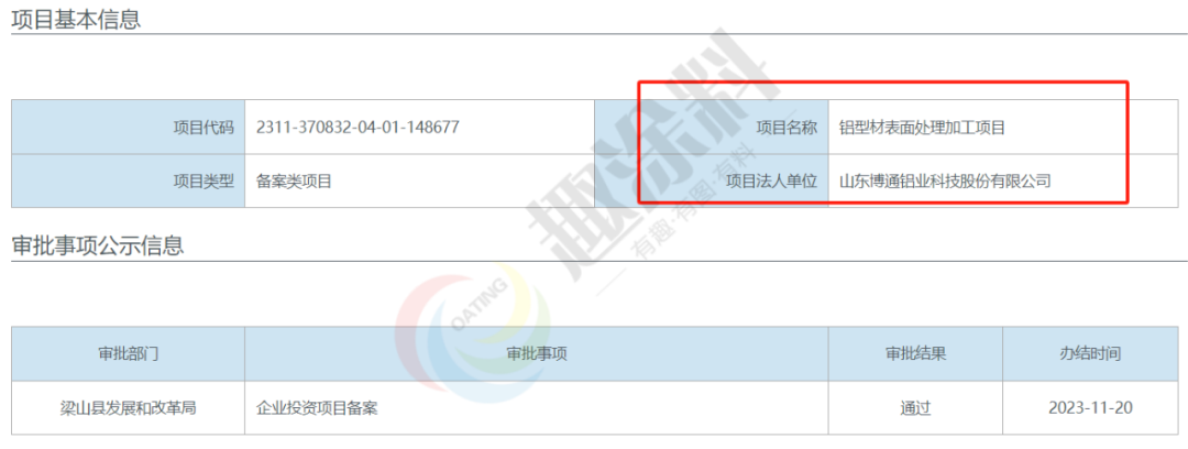 2023年11月20日,山東博通鋁業(yè)科技股份有限公司,鋁型材表面處理加工項目,在梁山縣發(fā)展和改革局,進行企業(yè)投資項目備案。