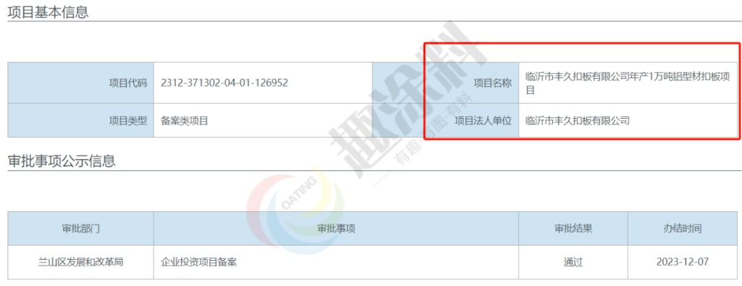 2023年12月6日,臨沂市豐久扣板有限公司,年產(chǎn)1萬噸鋁型材扣板項目,在蘭山區(qū)發(fā)展和改革局,進行企業(yè)投資項目備案。
