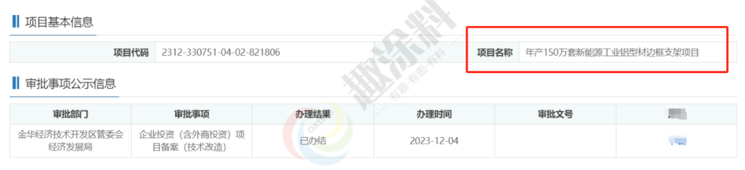 2023年12月4日,浙江欣裕光伏材料有限公司,年產(chǎn)150萬套新能源工業(yè)鋁型材邊框支架項目,在金華經(jīng)濟技術(shù)開發(fā)區(qū)管委會經(jīng)濟發(fā)展局,進行企業(yè)投資(含外商投資)項目備案(技術(shù)改造)。