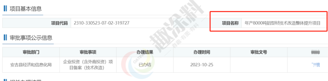 2023年10月25日,浙江新祥鋁業(yè)股份有限公司,年產(chǎn)8000噸鋁型材技術(shù)改造整體提升項目,在安吉縣經(jīng)濟和信息化局,進行企業(yè)投資(含外商投資)項目備案(技術(shù)改造)。