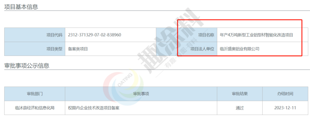 2023年12月11日,臨沂盛奧鋁業(yè)有限公司,年產(chǎn)4萬噸新型工業(yè)鋁型材智能化改造項目,在臨沭縣經(jīng)濟和信息化局,進行權(quán)限內(nèi)企業(yè)技術(shù)改造項目備案。